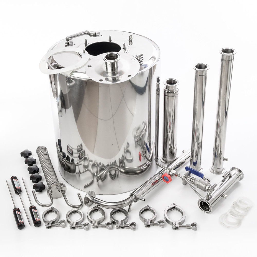 All connections are clamp, they are completely tight, much more convenient than threaded ones. The cube is easy to clean after distillation due to the wide mouth of 110 mm. The thermometers included in the package will allow you to continuously monitor the temperature inside the cube, drawer, in the selection unit. Owner reviews indicate the convenience of a distillation column in any mode of use.